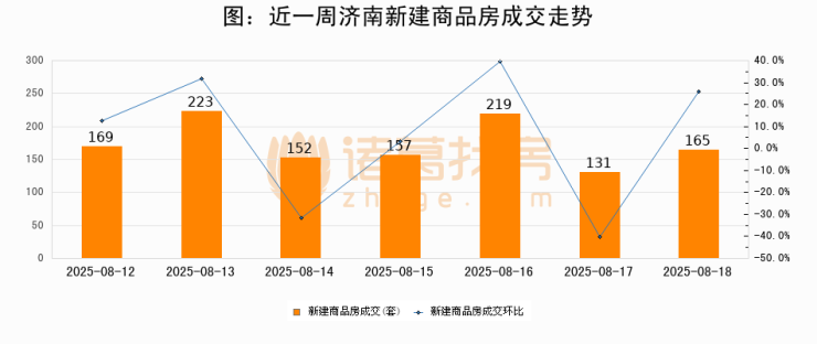 根据济南市住房和城乡建设局数据显示,2025年08月18日济南新建商品房成交165套,较昨日增加34套,环比上涨25.9%。近一周济南新建商品房日均成交174套。08月18日单日成交165套,低于近一周平均水平5.2%。