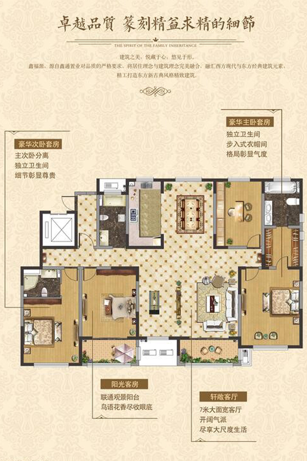 鑫福源别墅社区为低密度高端住宅社区,容积率1.08,建筑密度23%,汽车位配比高达1:2,别墅产品种类分为花园别墅和滨水花园别墅,别墅花园拟采用定制模式,为业主打造不同风格的私家园林。双拼别墅采用类独栋别墅规划,约360㎡的豪阔空间,南北双私密花园,超大露台,保障圈层生活的纯粹和居住氛围的和谐,强调交往空间的超尺度,赋予空间以礼仪与待客之道,更不乏私密之感;超宽门廊、豁朗进深,盛纳主宾平等并行的礼仪风度,更凸显巨室豪门的独尊意识与私有尊崇,为贵胄阶层度身定制全方位生活排场。