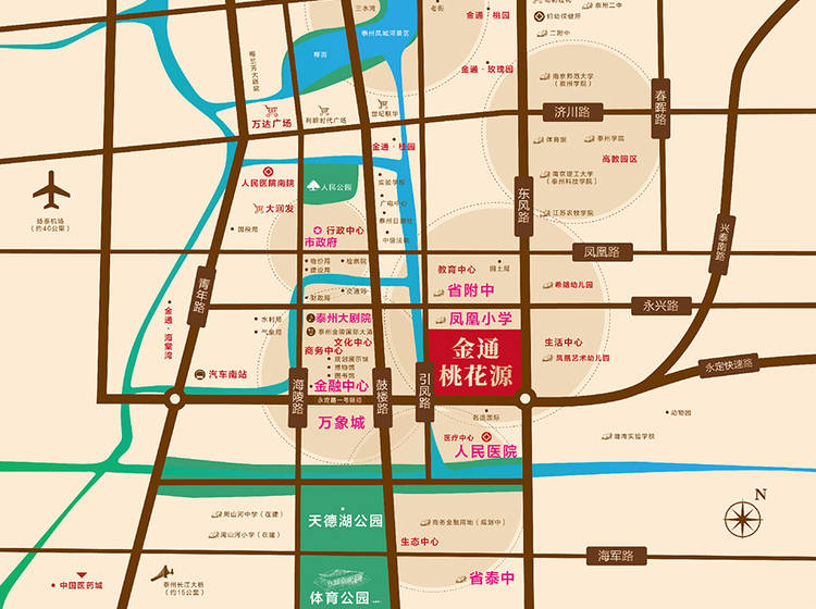 园博园、天德湖公园、泰州体育公园(在建)、凤城河风景区