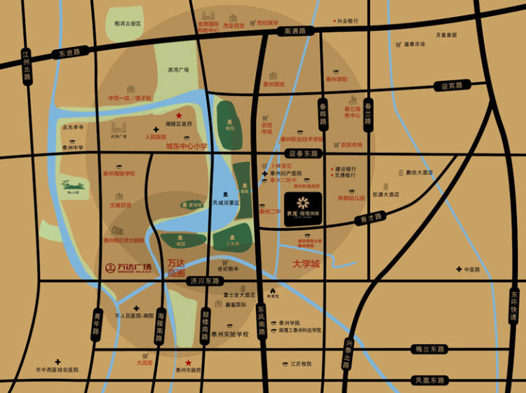 本项目位于泰州海陵区城东与城中的结合处,育才路与春晖路交叉口,紧邻泰州二附中、泰州二中、南师大泰州学院,距离国家4A级景区凤城河景区仅1公里左右,周边交通发达,配套完善,生活气息、文化气息浓厚。
