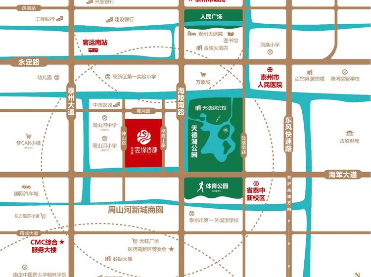 项目所处泰州高级医药高新技术产业园区内,路网交通便捷(靠近海军大道、泰州大道、海陵南路),与市区、新区核心均在10分钟车程范围,商业、医疗、娱乐配套齐全(如万象城、万达广场、排名前列人民医院),东侧紧邻大型生态氧吧“天德湖公园”,西侧临近周山河学校,南侧靠近规划建设中的园博园,宜居价值凸显。