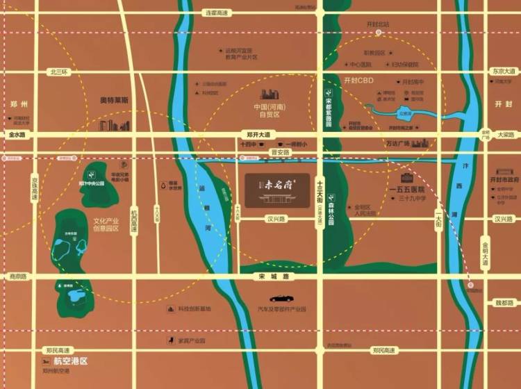 北大资源城东起规划中的十三大街,西临中牟边界,南到陇海铁路,北临连霍高速,占地面积约35平方公里。项目交通便利,周边有连霍高速、大广高速、京珠高速、日南高速和郑民高速等五条高速公路,从郑民高速到达新郑机场仅需40时间;项目距省会郑州37公里,距开封市区9公里,郑开城际铁路横穿项目区域,实现与郑州的“”对接。