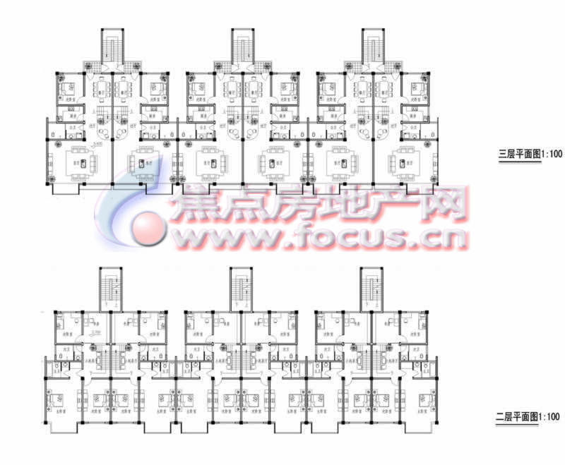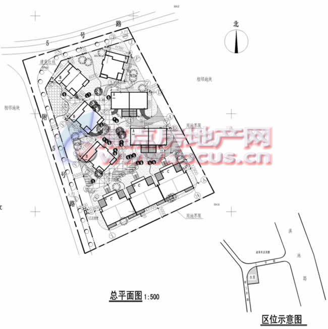 五房七里香建筑采取东南及西南向错落摆布,争取在有限的用地范围内使每栋房屋有充足的采光间距及良好的视觉通透性。根据规划要求建筑范围退让东侧及南侧相邻地块 5 米间距。利用退让间距形成环形消防通道及机动车行道。在地块中部沿南北向设置步道系统,同时利用此步道系统组织中心绿化景观,在交通上实现人车分流。本地块设置两个出口,分别位于地块南侧及西侧,西侧为主要出入口,南侧为紧急情况下才启用的疏散出口。