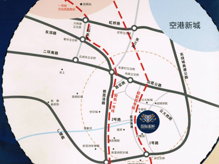 从主城出发走到彩云北路与昌宏路交叉口,沿昌宏路走570米进入昆岭路,沿昆岭路走370米进入云大西路,沿云大西路走2.7公里,直走进入环岛,沿环岛走40米,直走进入顺通大道,沿顺通大道走710米左右即可看到项目楼体