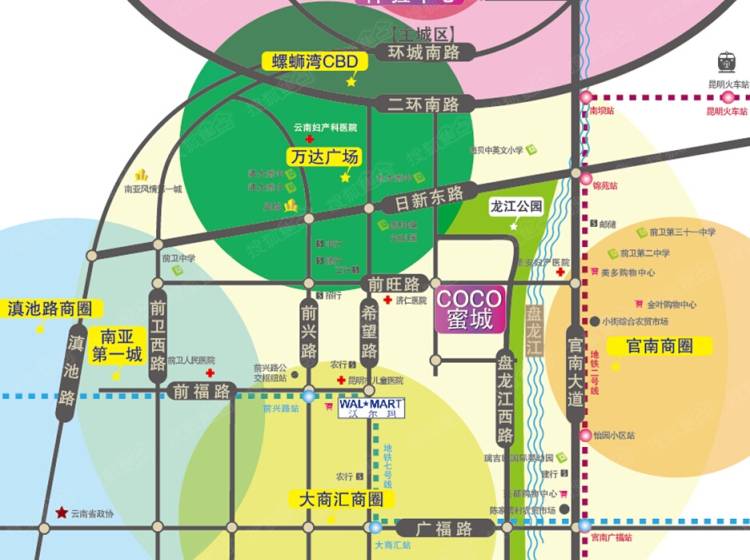 购物:沃尔玛光辉城市店、昆百大电器光辉城市店、昆明市红太阳商贸中心、大商汇、南亚风情第壹城、臻万百货、绿美地社区生鲜连锁超市、云纺商业城 、万达广场。