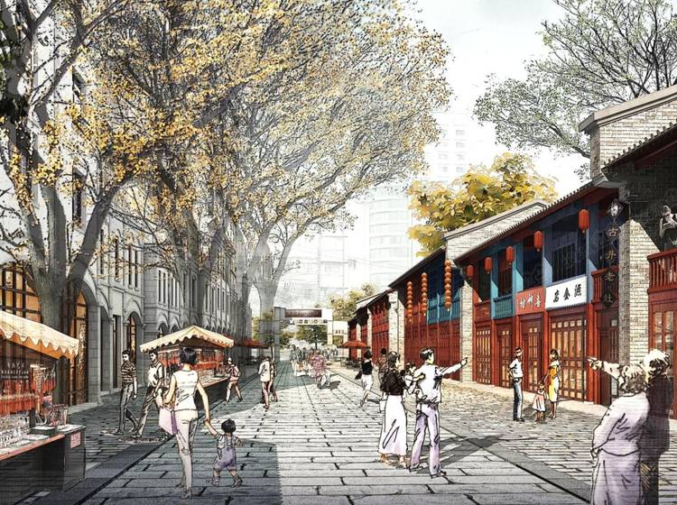 南强街依托自身特有的建筑形态特色,以小而精的、独具文化的观点规划理念,把整个街区划分为19个院落,71间临街商业。依托街、巷、院等街道形态,形成多元化的商铺形态。院落与商铺,相互错落,动静结合,成为了南墙街巷独有的商业建筑景观。