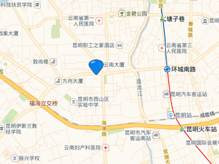 公交:3、44、58、64、73、75、80、89、106、109、110、127路 自驾:1) 沿前兴路行驶2.6公里,过右侧的昆明西山万达广场约260米后,直行进入海埂路 2) 沿海埂路行驶980米,左转进入云兴路 3) 沿云兴路行驶1.1公里,过左侧的云牧楼,直行进入西园路 4) 沿西园路行驶660米,过左侧的光明园约240米后,左转 5) 行驶60米,左转 6) 行驶220米,到达终点