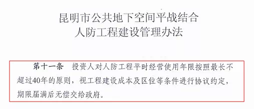 此外,在2016年发布的《昆明市人民政府关于引发昆明市公共地下空间平战结合人防工程建设管理办法的通知》中提及,投资人对人防工程平时经营使用年限最长不超过40年。