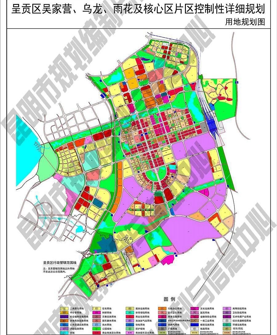 规划:呈贡新区大致以昆玉高速公路划分东西,以中央公园划分南北,并按不同功能划分为片区:吴家营片区、雨花片区、斗南片区、乌龙片区和昆明呈贡信息产业园等。