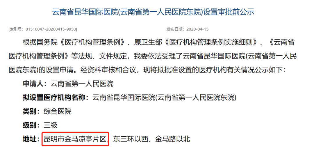 最值得注意的是,在全新规划中落实了区域医疗中心和体育设施用地的位置。其中医疗中心位于云南冶金高级技工学校附近,在此之前,云南省卫健委4月发布了昆华国际医院(云南省排名前列人民医院东院)设置审批前公示。根据公示内容,昆华医院将在凉亭片区设立一家分院,设计床位2000张。