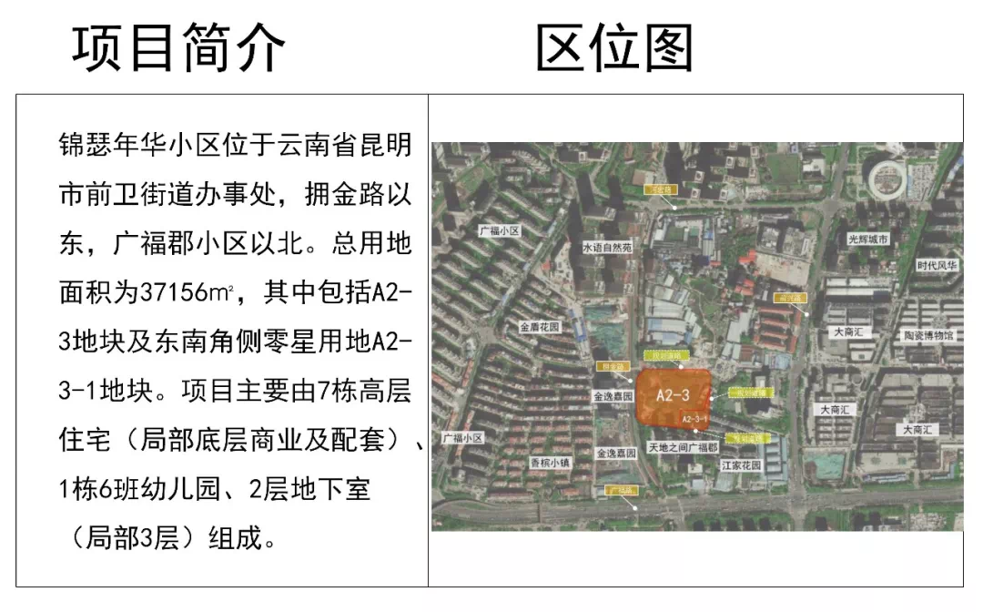 锦瑟年华小区(恒泰滇池名门新地块)位于云南省昆明市前卫街道办事处,拥金路以东,广福郡小区以北。总用地面积为37156㎡。其中包括A2-3地块及东南角侧零星用地A2-3-1地块。项目主要由7栋高层住宅(局部底层商业及配套)、1栋6班幼儿园、2层地下室 (局部3层)组成。