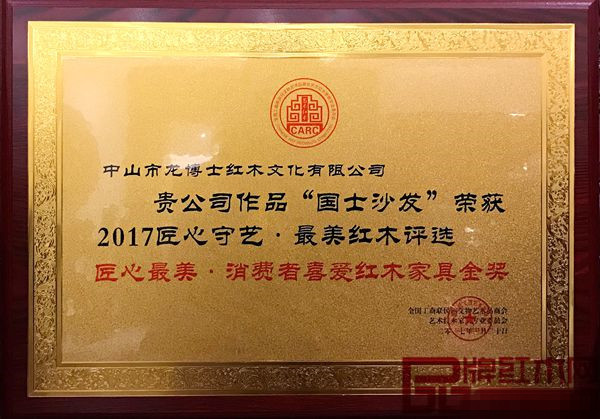 3月14日,2017“匠心守艺·最美红木”的颁奖典礼在中国(大涌)红木文化博览城(以下简称红博城)盛大举办,中山市龙博士红木文化有限公司(以下简称龙博士家具)选送的黑酸枝《国士沙发》经过红木行业专家顾问现场评分,凭借工艺精细,造型华贵庄重,将古典韵味与现代时尚元素优质的相融合,荣获匠心最美·新古典红木家具金奖。