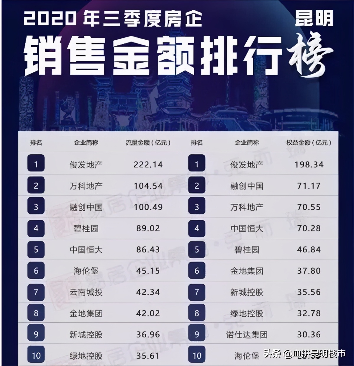 近期,克而瑞数据发布了今年前三季度昆明市场上各大房企销售业绩,流量金额排名前十的房企与去年同期相比变化不大,值得一提的是,俊发地产仍然蝉联榜首,排名前五的也依然是俊发、万科、融创、碧桂园和恒大。