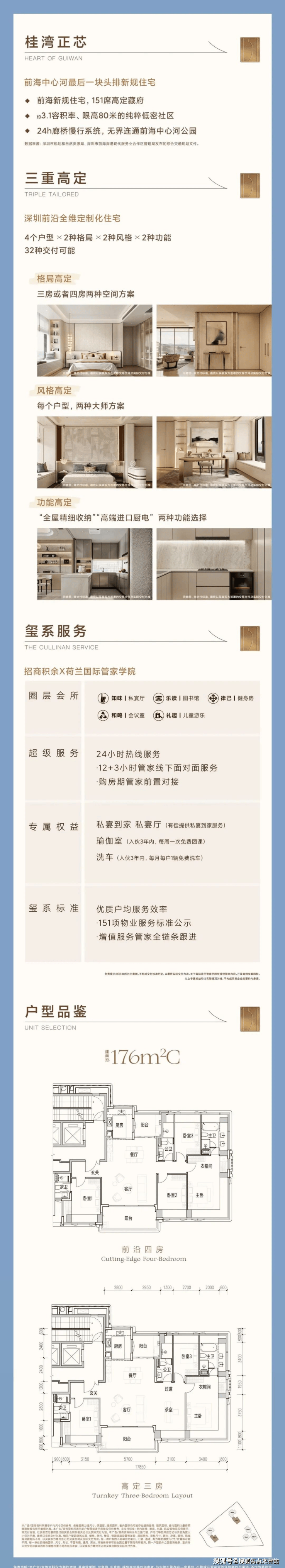 招商海晏府(宗地号T201-0232)位于前海桂湾北部区域,紧邻双界河,拥有桂湾头排无遮挡河海视野景观。这是前海首个入市的「新国标」住宅项目,也是前海近五年来首宗「三无」宅地——无配建、无7090户型限制、无售价限制。项目占地约8287㎡,容积率仅3.1,建筑限高80米,由3座23层住宅组成,共规划151户。产品全部为139㎡起跳的四房以上大户型,定位纯粹的高端改善型住宅社区。项目最大的亮点在于定制化精装——前海首个支持户型定制的新盘,每个户型至少2种空间方案、2种装修风格、2种功能选择,真正实现「买房即定制」。