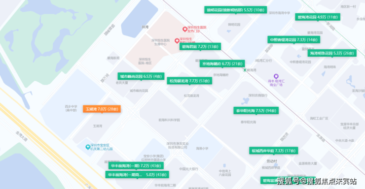 楼龄十年左右的松茂御龙湾一期和二期,以及华丰前海湾一期和二期,成交均价都在7.5万/㎡左右。