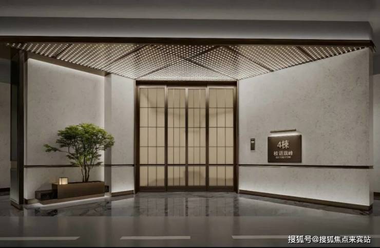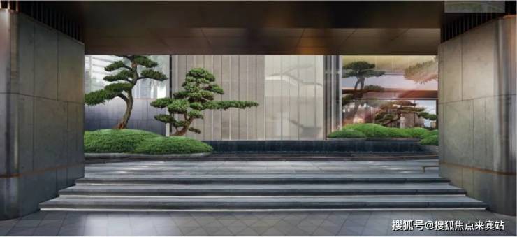 受此启示,绿城打造桂语旗峰项目时针对小区入口和大堂,做了颜值与功能上的双重优化:首先,归家大门利用长围墙及超尺度雨棚打造水平约55米的超强延伸感,营造恢宏大气的归家场景;约18米深度打造多层次归家景观,酒店式归家入口到浪漫星空顶,再到前庭礼仪水院叠水景观+造型松,营造极具艺术造型感的过道空间,让每一步都能悦见不同归家景象。功能方面,完备的归家方式,让人行、车行、落客等每种出入方式都互不干扰。雅致优美的阵列景观、完备细腻的功能空间,让这一条“线”成为了具备丰富景观和功能内容的载体。