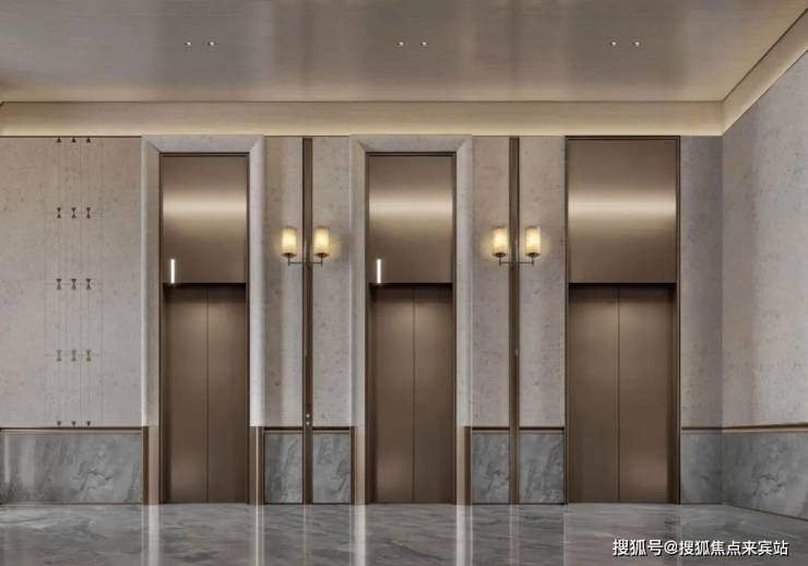 入户内厅再往里延伸,就到了入户电梯厅,酒店式通顶设计的电梯门,质感的氛围灯及石材及其他材料的协调搭配,也是用细节写就的问候。