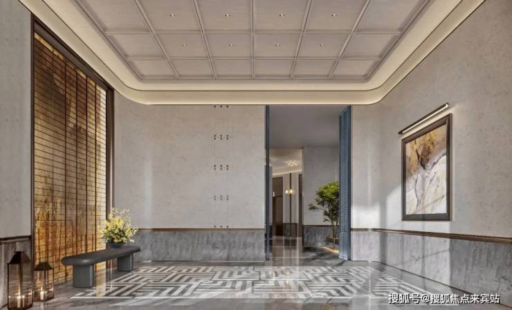 入户大堂空间是设计师结合石材铺装和利用各种材料的纹理搭配打造的高颜值形象空间,入户内厅是自然温馨的邻里社交及友人接待空间,营造安全且舒适的社交场所,让热气腾腾的中国式熟人邻里社区再次回归。