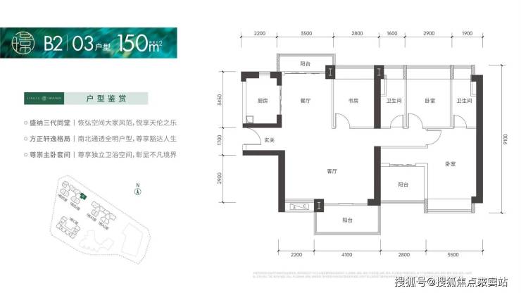 户型面积布局03150平四房两厅两卫设计的是竖厅格局,南北通透双阳台,客厅6.3米大开间,进门入户玄关,4个卧室分别做到了3.5米/2.9米/2.8米/2.8米的宽度,U型厨房,卫生间干湿分离,得房率:75.66%(不含赠送),客厅阳台主朝西南向。