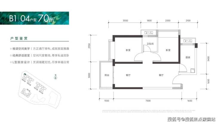 户型面积布局0470平两房两厅一卫设计的是竖厅格局,客厅3米开间,餐客厅一体化设计,2个卧室分别做到了2.95米/2.35米的宽度,L型厨房,卫生间干湿分离,得房率:75.66%(不含赠送),阳台朝西北向。