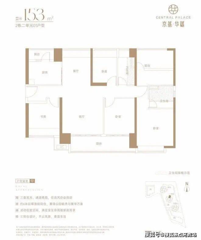 153㎡的5房2厅2卫,设计的是竖厅南北通透格局,四开间朝南,全屋飘窗,客厅连接次卧出6米长大阳台,U型厨房,还带1个小生活阳台,卫生间干湿分离,得房率约73%(不含赠送),阳台主朝东南向。🌈深圳京基华樾❄️售楼处热线:400-856-3771【售楼处电话已认证】✨☃☃☃