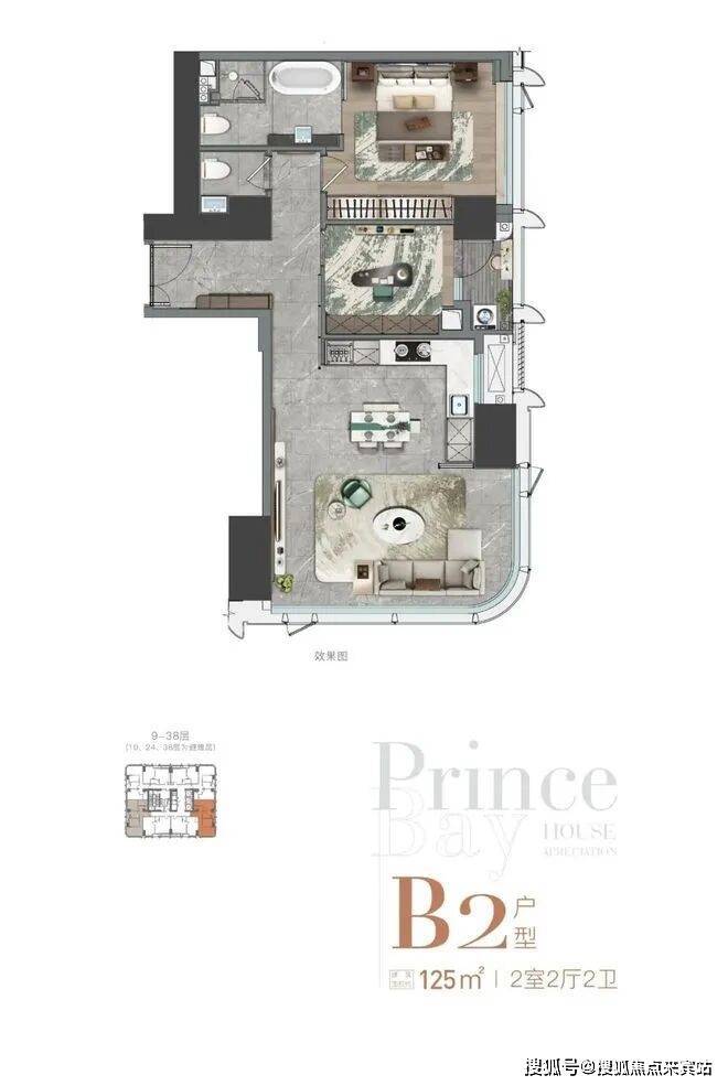 东北、西北向(9-48层) B1户型,115㎡ 2室2厅1卫,特点是客厅270°弧形采光面,主卧带有独立的衣帽间
