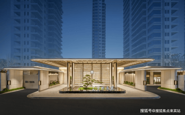 主入口门庭以学府高雅气质与庄重高墙规制面向城市,营造一方落客港湾,迎接高知菁英入境。臻选冠幅近5.5米的名贵迎客松,并以600余片定制青玉打造巨幕奢石景墙,呈现尊崇且轻松的惬意归家感。