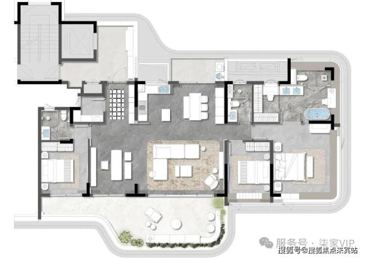 邱德光设计岛心多维共享空间,如社区“灯塔”,以蔚蓝泳池为视觉心脏,用拱廊构建地中海式或南洋风情社交氛围,涵盖恒温泳池、宴会厅、雪茄室、瑜伽室、咖啡厅、茶室等塔尖社交场域。