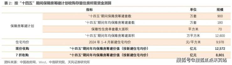 如果“政府收储存量房”的出发点是“保障房建设”,那么收储的资金压力可能并不大。按照 “十四五”期间全国计划筹建保障性住房近900万套、年均约180万套、单套面积不超过70平方米来计算,如果全部通过收储来筹集房源,每年大约需要1.3万亿元(2024年1-4月新建住宅销售均价约为9978元/平方米)。