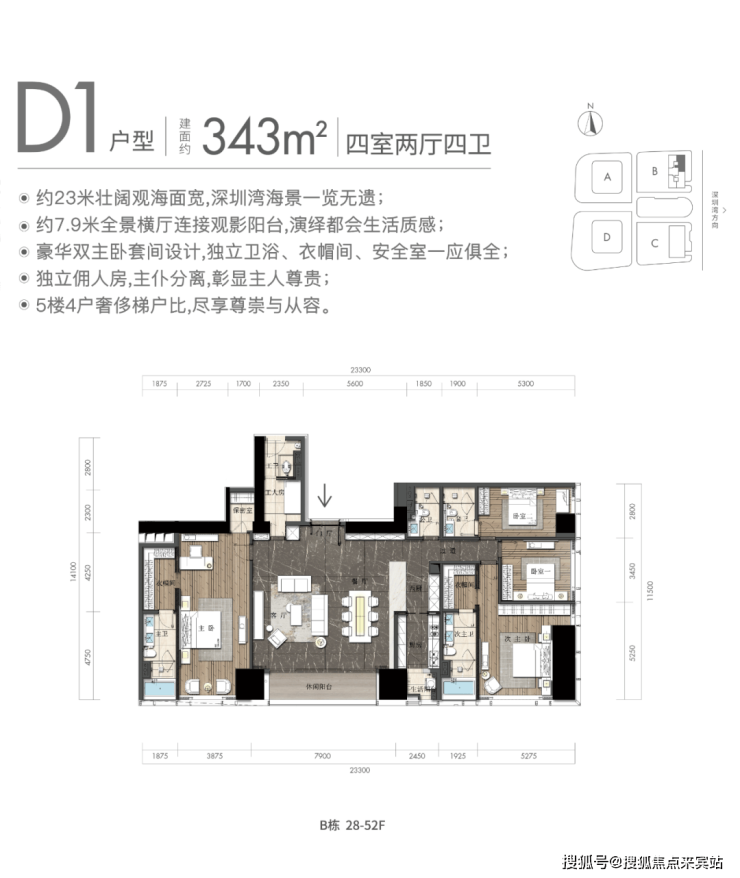 观景阳台:高区340平米户型,东面23米宽无敌海景视野(塔楼总观景面约46米)