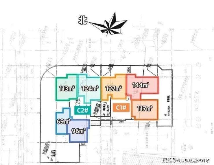 两栋住宅相连,C2户型分为东向的124㎡及113㎡、南向的96㎡、北向的69㎡。