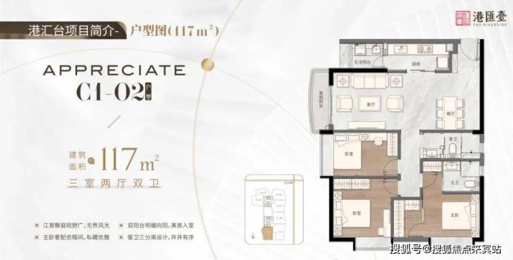 117㎡三房两厅两卫,阳台飘台视野广,无界风光,主卧奢配衣帽间,私藏优雅双阳台向阳,美景釆光入室,客卫三分离设计,井井有序