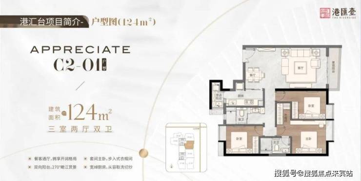 124㎡三房两厅两卫,餐客通厅,拥享开阔格局,套间主卧,步入式衣帽间,双向阳台,270度瞰江赏景,宽绰厨房,从容取洗切炒