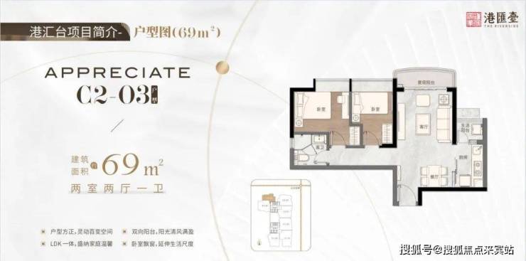 69㎡双阳台两房两厅一卫,户型方正,灵动百变空间,LDK一体,盛纳家庭温馨,双向阳台,阳光清风,视野开阔,全飘窗设计,增加室内利用空间