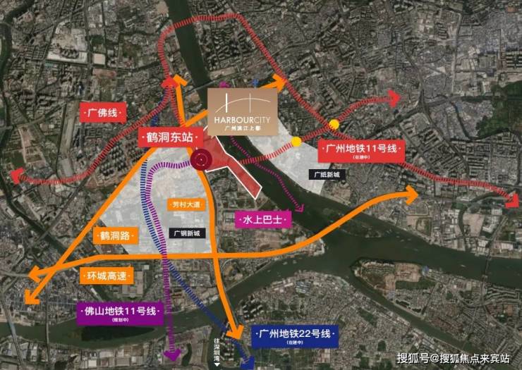 广州11号线以及佛山11号线鹤洞东站双地铁上盖,3横2纵大路网+公交站场+水上巴士,集水、陆、轨等多维交通方式于一体,半小时城央生活圈,1小时湾区生活圈。11号线,老城区换乘之王,可换乘13条地铁线,途经天河、白云、越秀、荔湾和海珠。