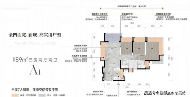 客厅270度采光设计,客厅更是采用了当下最流行的设计风格「无主厅化」,而且客厅的凸窗进深达到了80CM。入户玄关S型冰箱位,能更大释放出厨房的操作空间,阳台+三个卧室均拥有无敌开阔的视野。