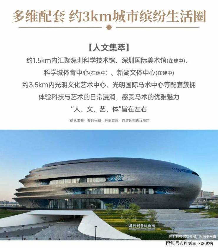 其他配套:约1.5km内汇聚深圳科学技术馆、深圳国际美术馆(在建中)、科学城体育中心(在建中)、新湖文体中心(在建中),约3.5KM内光明文化艺术中心、光明国际马术中心等配套簇拥。体验科技与艺术的日常浸润,感受马术的优雅魅力,“人、文、艺、体”皆在左右。
