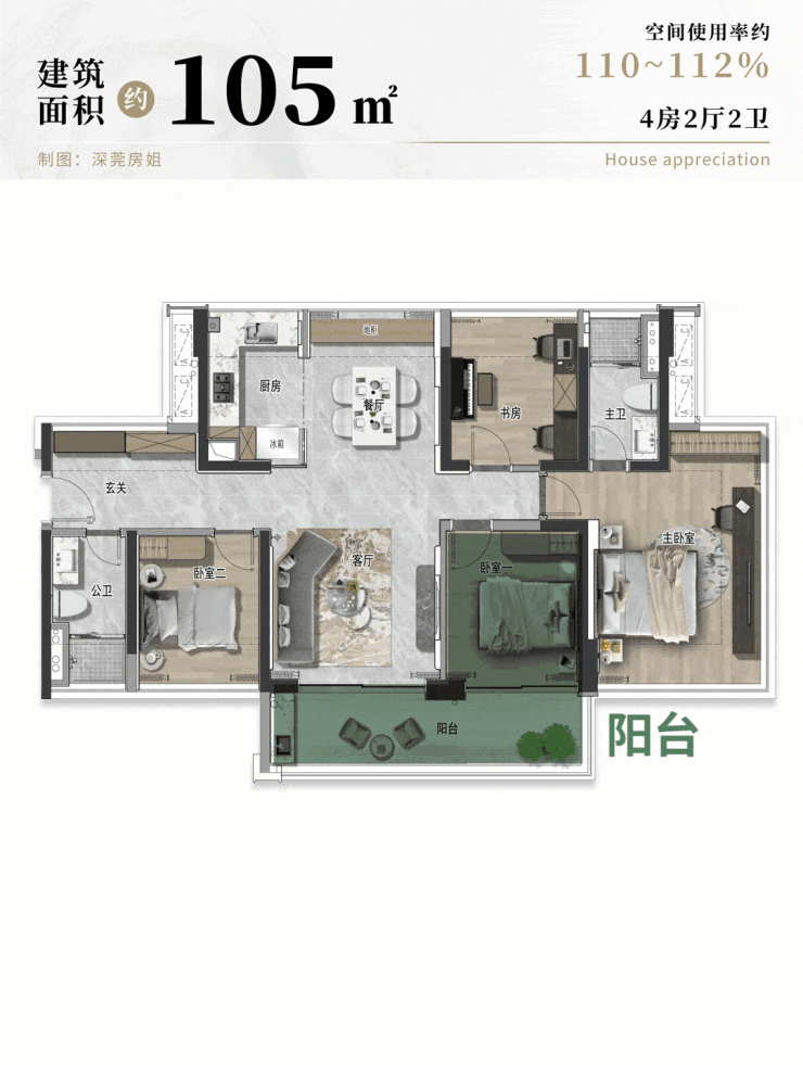 再把尺度拉高,来看建面约105平四房,可直接对比市面上约130平旧规产品。