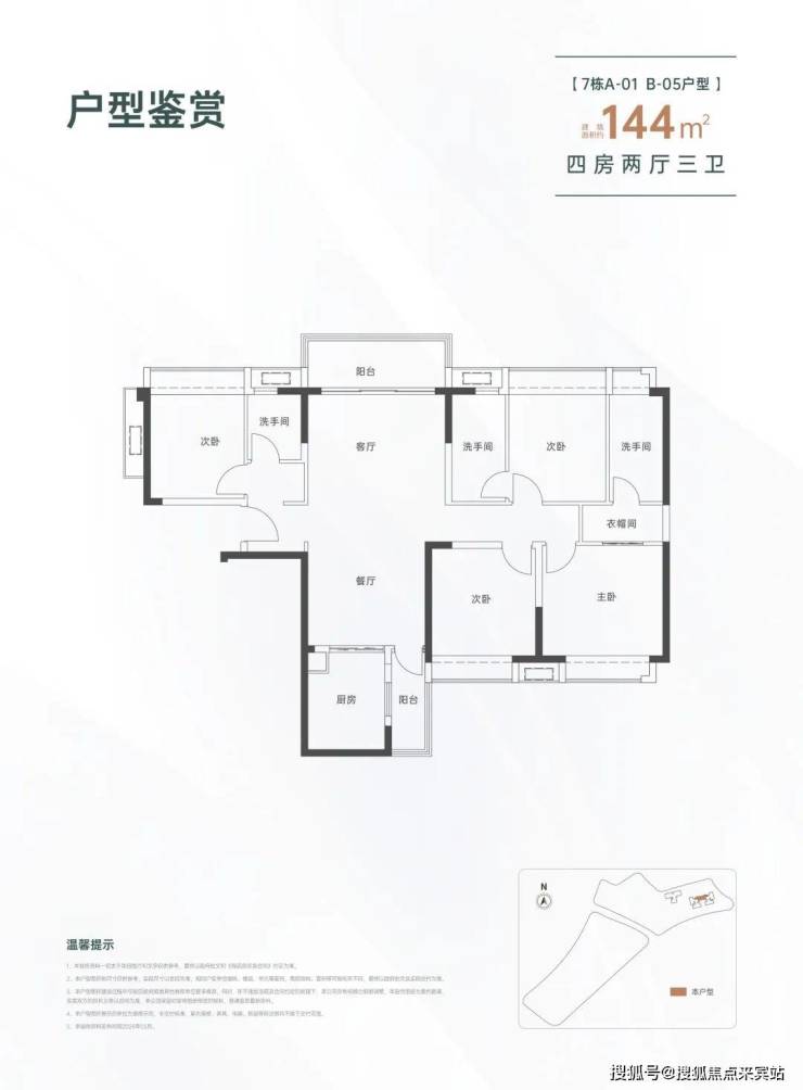 144㎡的4房2厅3卫,设计的是竖厅南北通透格局,进门入户玄关,LDKB一体化设计,双主卧套房,L型厨房还带1个生活阳台,公卫干湿分离,得房率约82%(不含赠送),阳台主朝西北向。