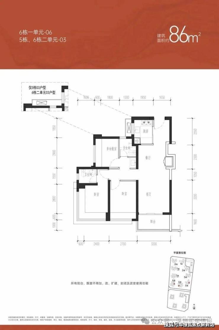 ①户型分析:小面积、低总价,最佳上车首选户型;全南向排布户型,多飘窗的设计,采光通风不错;户型方正,动静分区的设计注重隐私性;明厨明卫,三分离洗手间设计;②朝向:西南、东南向③视野:小区外围,临万丰路,看城市风景,施工建设区域【约85㎡三房两卫】户型分布:分布在7栋2单元、8栋、3栋,共710套,①户型分析:有横厅和竖厅两种户型,全屋7个飘窗、13米采光面,非常通透;预留超多收纳空间主卧双面采光,景观视野更开阔②朝向:东北、西北朝向③视野:社区花园和社区楼栋