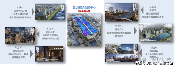 约160万㎡深圳会展中心,约154万㎡会展综合配套,形成包含城市地标、产业总部、商业中心、国际酒店群、产业展馆、精品公寓、生态公园、交通枢纽等复合功能物业群,构建集全球信息交流和消费体验于一体的会展商务平台