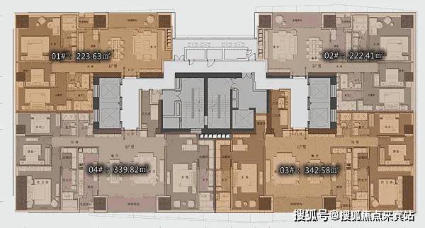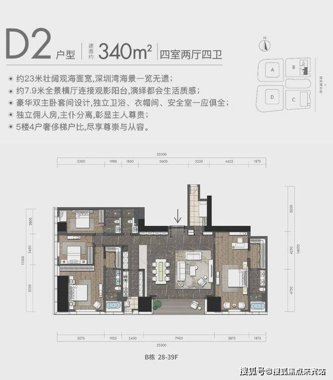 D2户型:约340㎡4房2厅4卫:B栋28-52F(高区),东朝向,户型与343㎡户型基本相同。
