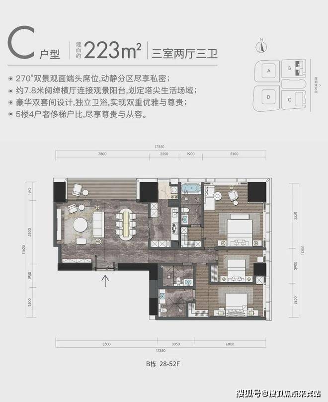 C户型:约223㎡3房2厅3卫:B栋28-52F(高区),东朝向