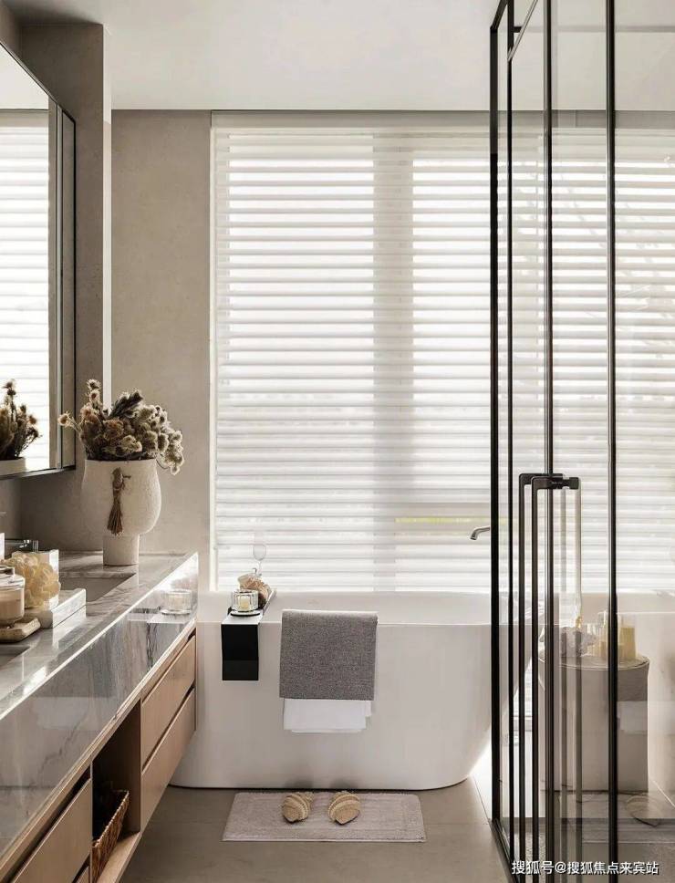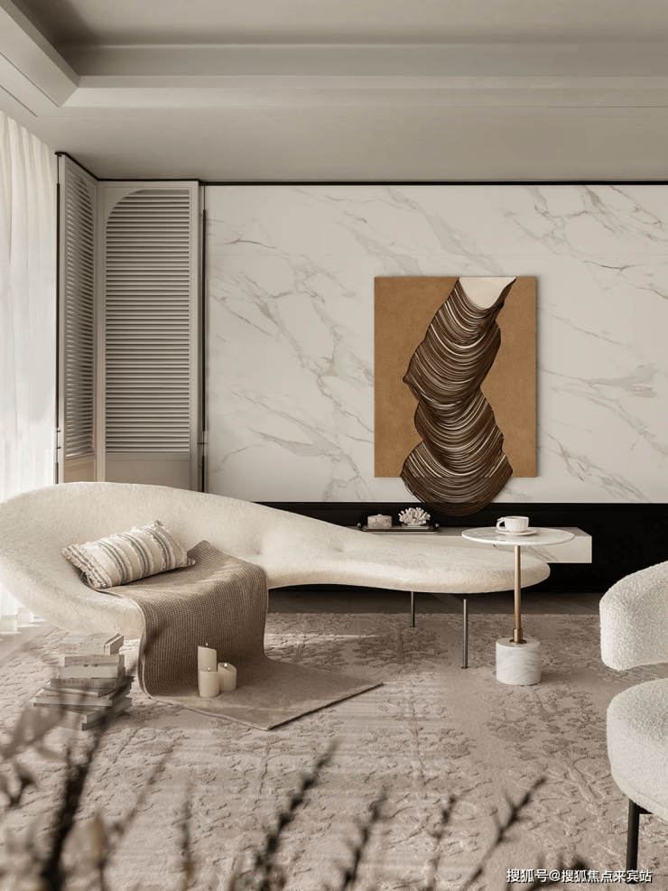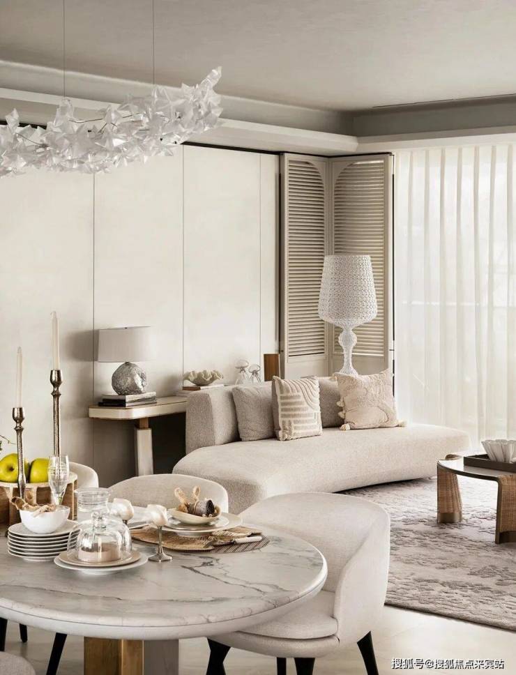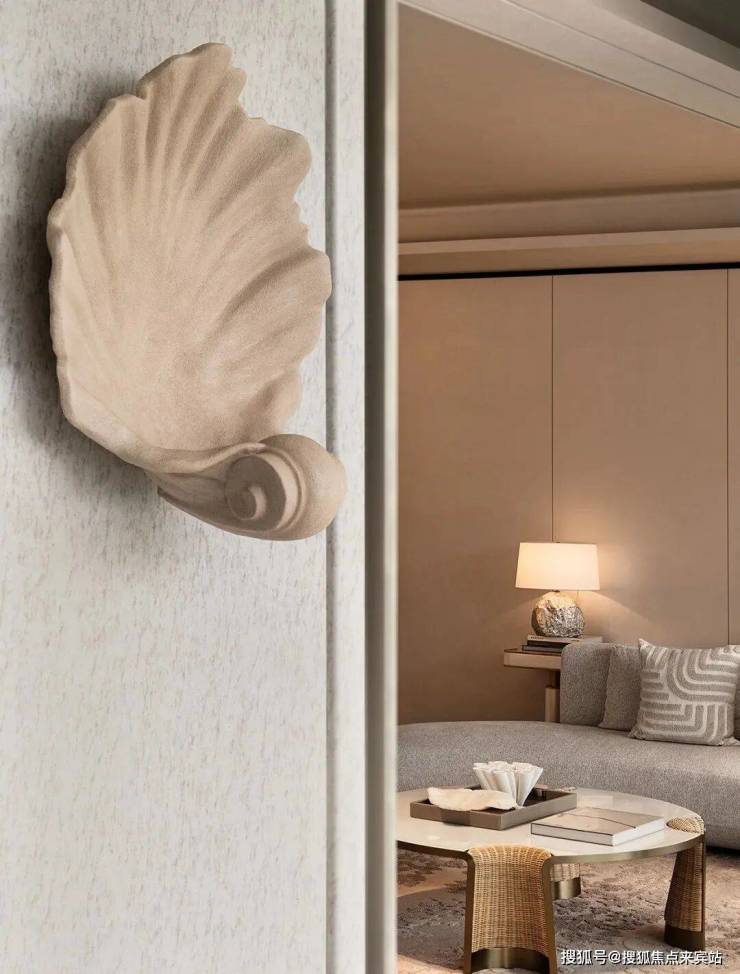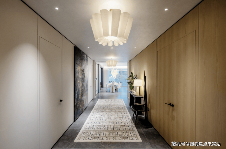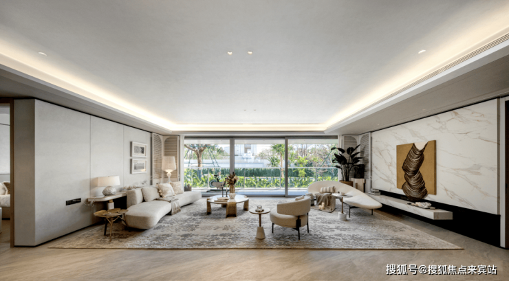步入室内,就是约10㎡的私享电梯前厅,层高约3.5m,三面采光的公区,270°无柱环形端厅,延伸出约44米的观景面,尽显主人气场。