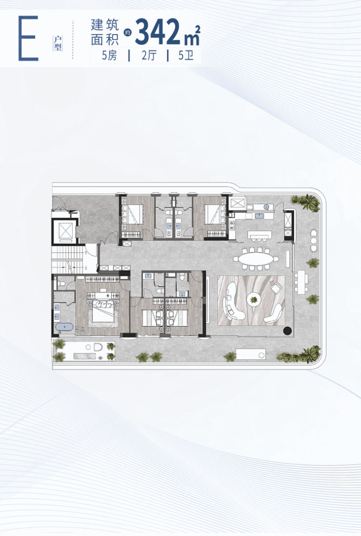全系一梯一户,其270°全景端厅,将“客厅+餐厅+厨房+阳台”形成一个LDKB连贯空间,通透无柱,环幕式视野无限开阔,打造家族社交门面。