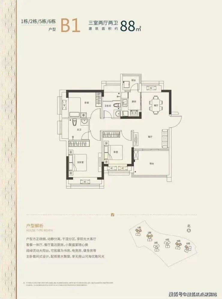 88㎡的3房2厅2卫,设计的竖厅南北通透格局,客餐厅一体化,动静分离,超大阳台灵动设计,L型厨房,也有带1个小生活阳台。