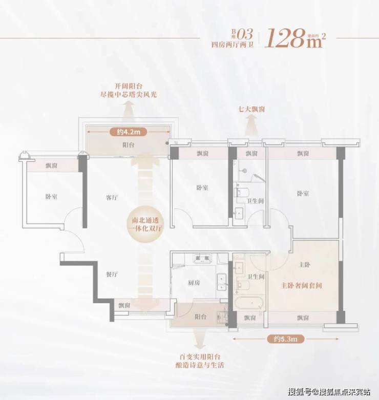 天宸128㎡户型图,双卫浴、双阳台设计,主卧大套房,空间开阔。