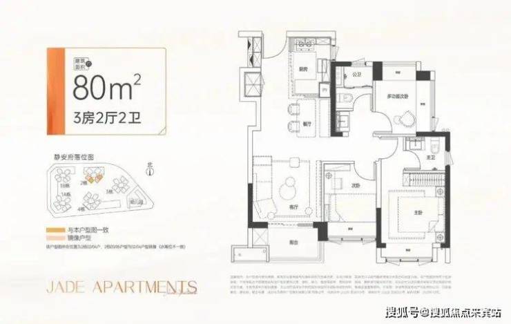 80㎡的3房2厅2卫,设计的是竖厅格局,客厅3.15米开间,S墙设计预留冰箱位,三开间朝南,次卧双飘窗设计,U型厨房,公卫三段式分离设计,得房率74.62%(不含赠送),有西南、东南或西北朝向。