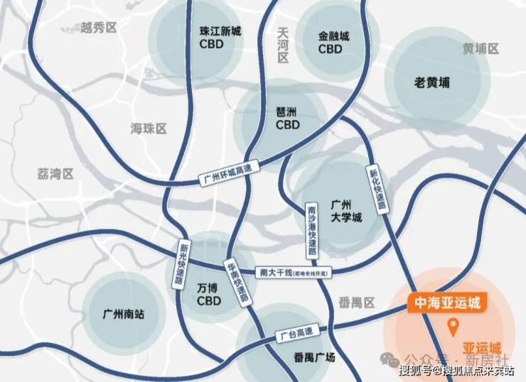项目周边有三纵三横高速路网,京珠高速、南沙港快线,联动天河、海珠各区;规划南大干线形成佛山-番禺-南沙的快速通道;新华快速北段改线动工,未来亚运城瞬达琶洲电商总部。