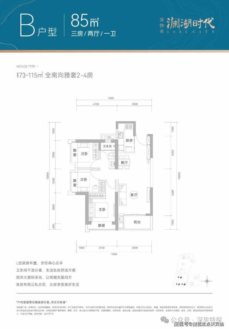 本次推售的为02地块(备案名:澜湖时代景愉府),总占地约1.26万㎡,总建面约10.57万㎡,计容建面约7.32万㎡,容积率5.76,绿化率40.01%。由1栋3个单元组成,1/2单元总高50层,3单元总高38层,规划744户,其中可售商品房592套(本期可售约590套),配备866个停车位,车位比1:1.16,满足日常出行需求。项目产权年限70年(2022.8.2-2092.8.1),由深圳市国贸物业管理有限公司提供物业服务。